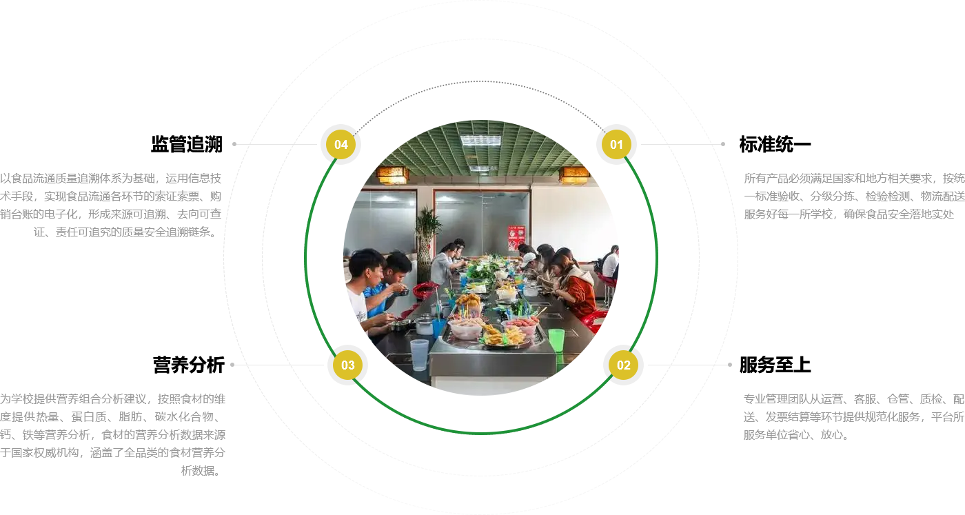 校園營(yíng)養(yǎng)餐聚焦中小學(xué),著眼公共食堂食品安全,依托標(biāo)準(zhǔn)的運(yùn)營(yíng)與嚴(yán)格的管理,以數(shù)字化食安監(jiān)管平臺(tái)為核心,確保食材供應(yīng)實(shí)現(xiàn)全溯源、全檢測(cè), 保障食品安全,用心關(guān)愛學(xué)生每一餐。